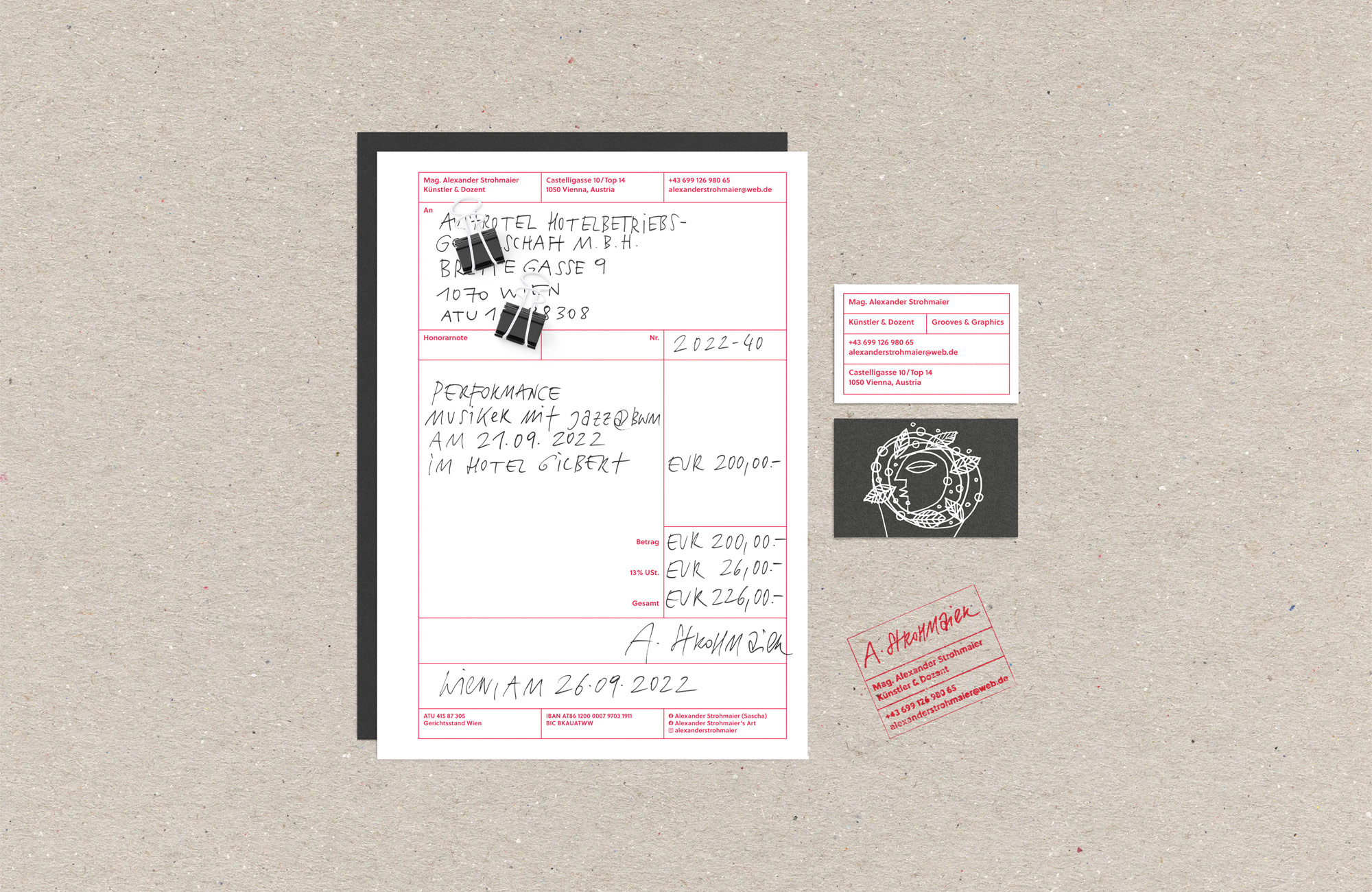 Ganz im Einklang mit seiner vielfältigen künstlerischen Tätigkeit schreibt Alexander seine Honorarnoten mit der Hand. Um nicht von seiner charakterstarken Kalligrafie abzulenken, war es essentiell, das Grafik Design so schlicht wie möglich zu halten und Alexander die Erledigung seiner administrativen Arbeit so leicht wie möglich zu machen. So entstand ein Formular mit einem roten Raster und einer Groteskschrift, das – in Kombination mit der in Schwarz gehaltenen Handschrift – besonderen Charme entfaltet.