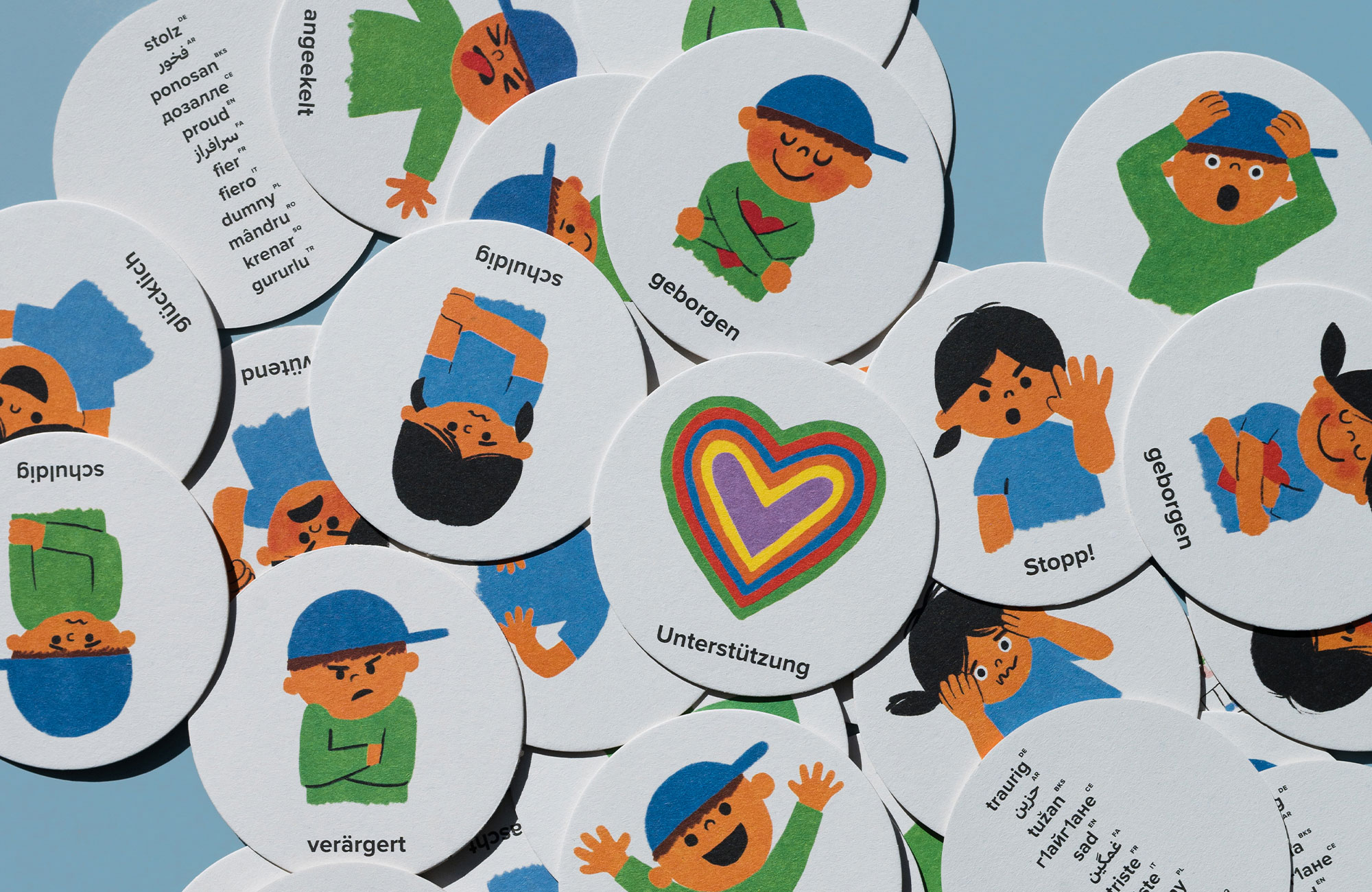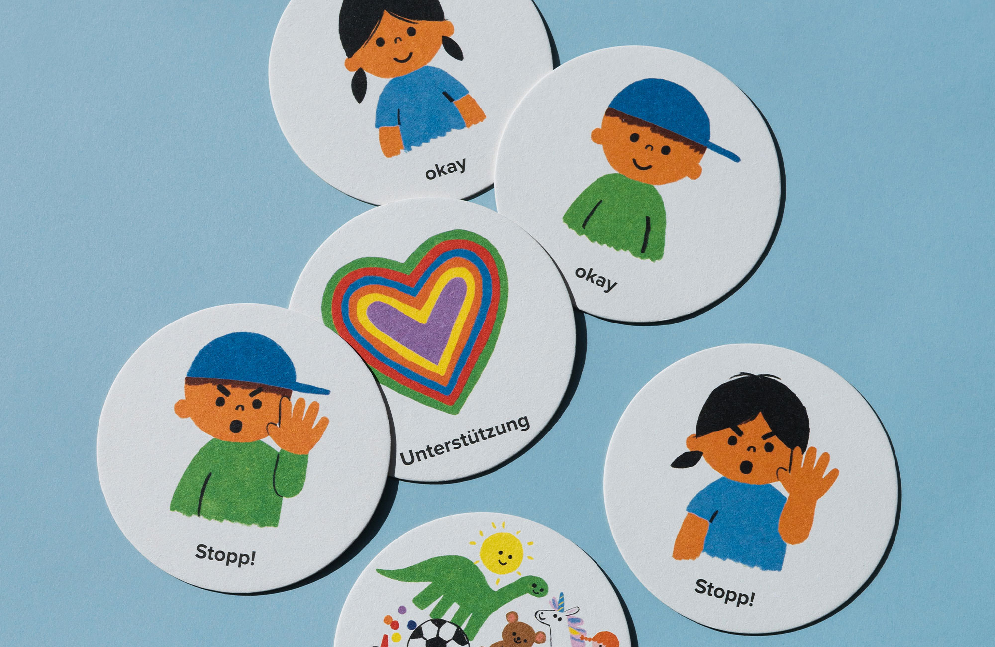 Bureau Smejkal war von Anfang an in die Produktentwicklung eingebunden. In enger Abstimmung mit der Zeichnerin Joanne Liu entstanden im ersten Schritt reduzierte, impactstarke Illustrationen, die im Zuge des Designprozesses von Kindern, Psychotherapeut*innen und Pädagog*innen im Hinblick auf ihre Aussagekraft in der Praxis getestet wurden.