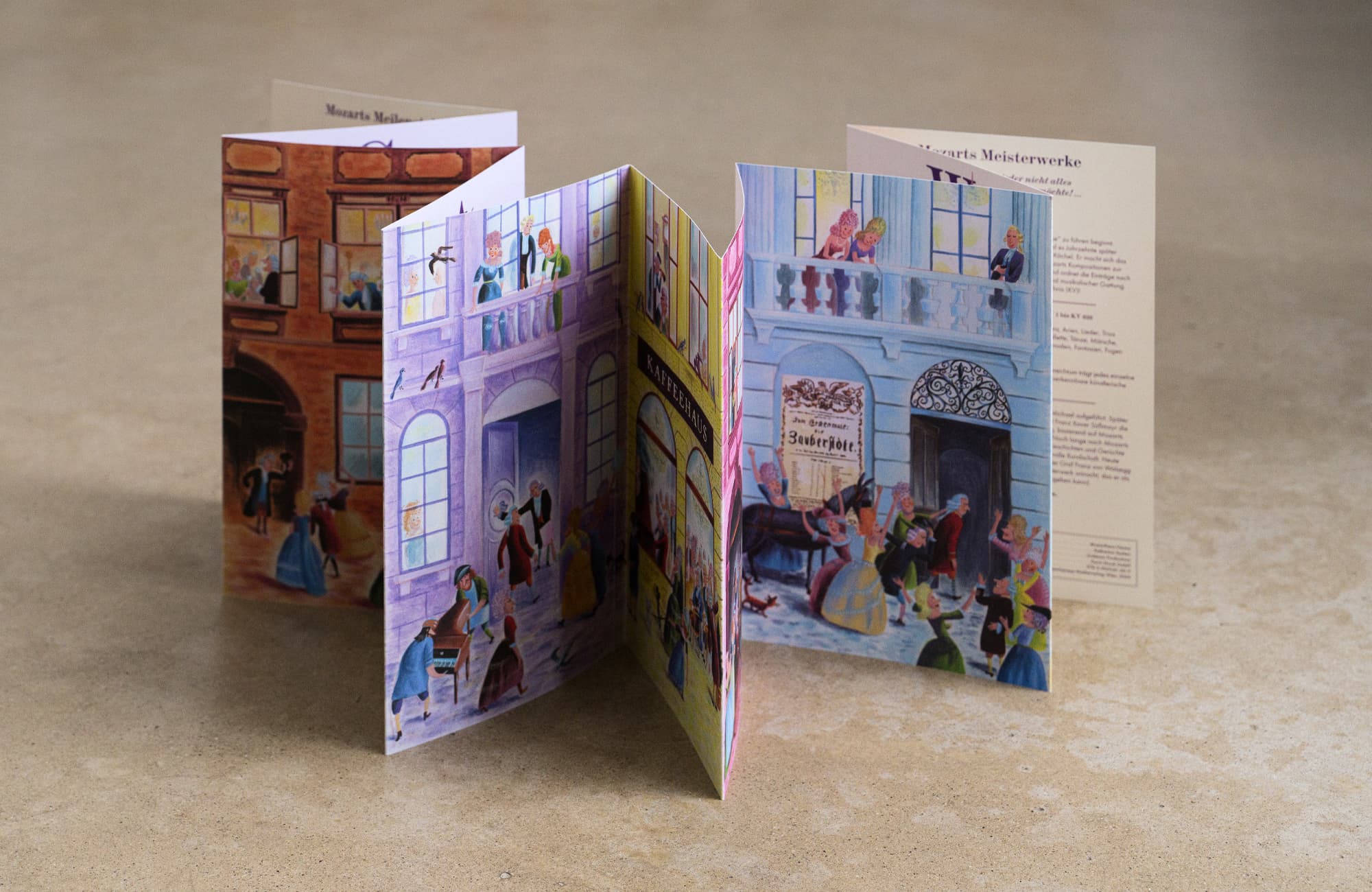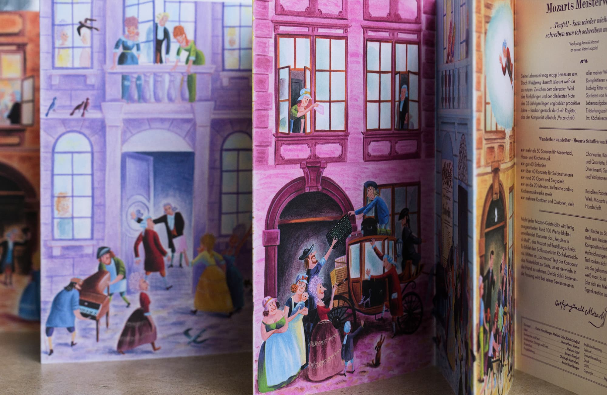 Der Leporello fungiert sowohl als (Vorlese-)Lektüre als auch als Silent Book und freistehendes Display. Ein wahres Vergnügen für alle Mozart-Liebhaber*innen von 4 bis 99 Jahren.
